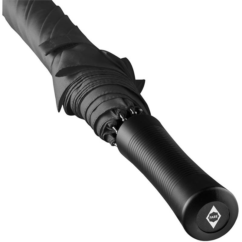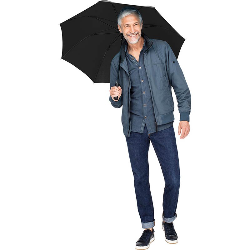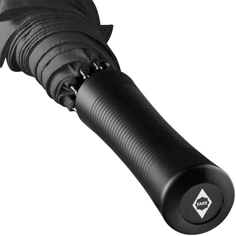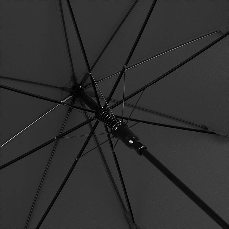 Convenient automatic function for quick opening, Windproof system for higher flexibility and stability in windy conditions, flexible fibreglass ribs, straight dull black plastic handle with promotional labelling option, higher corrosion protection due to galvanized steel shaft