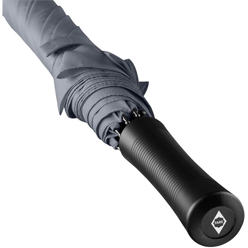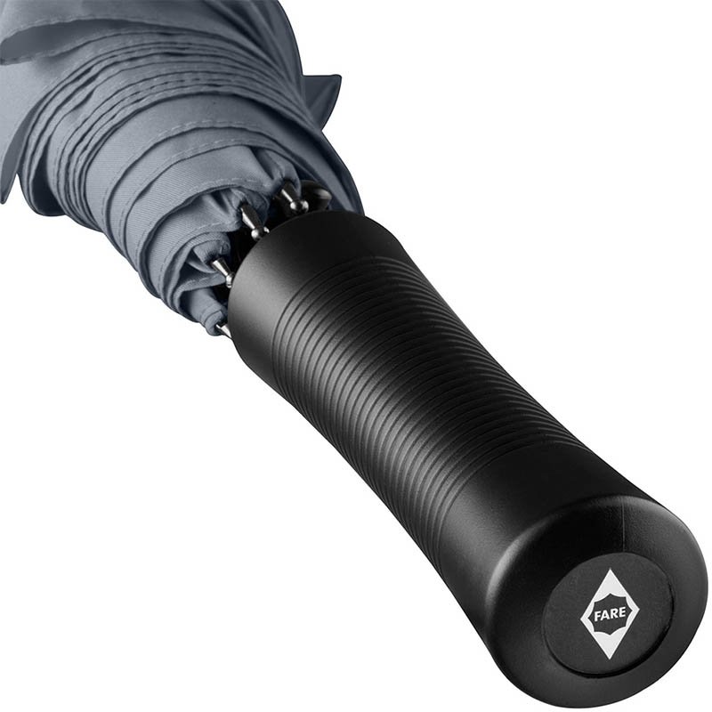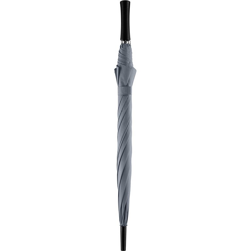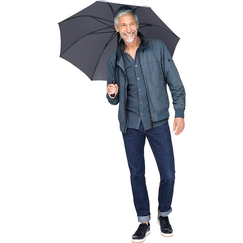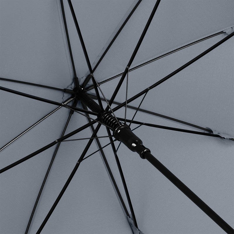 Convenient automatic function for quick opening, Windproof system for higher flexibility and stability in windy conditions, flexible fibreglass ribs, straight dull black plastic handle with promotional labelling option, higher corrosion protection due to galvanized steel shaft