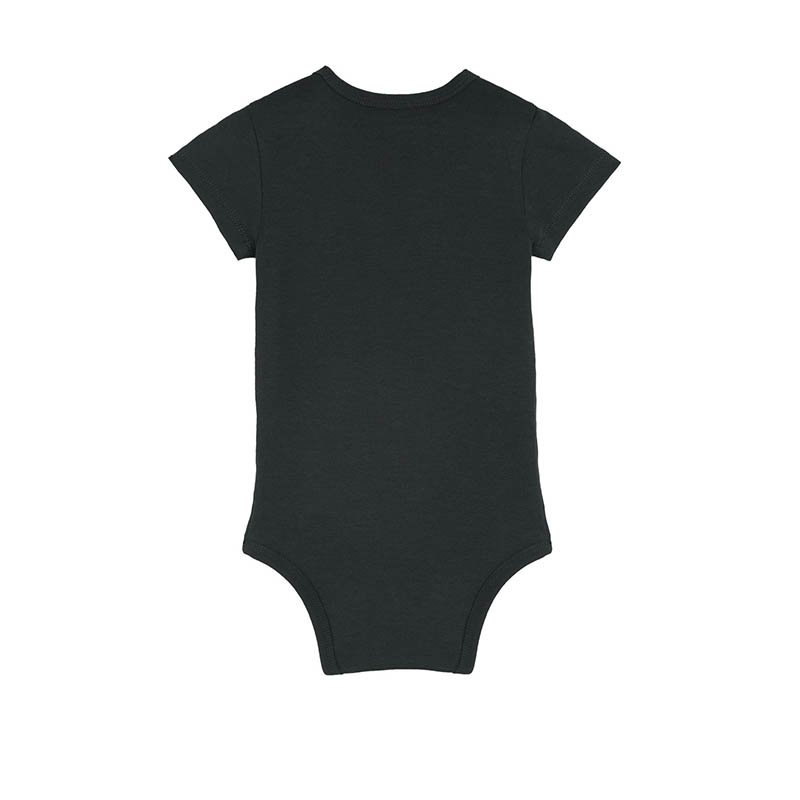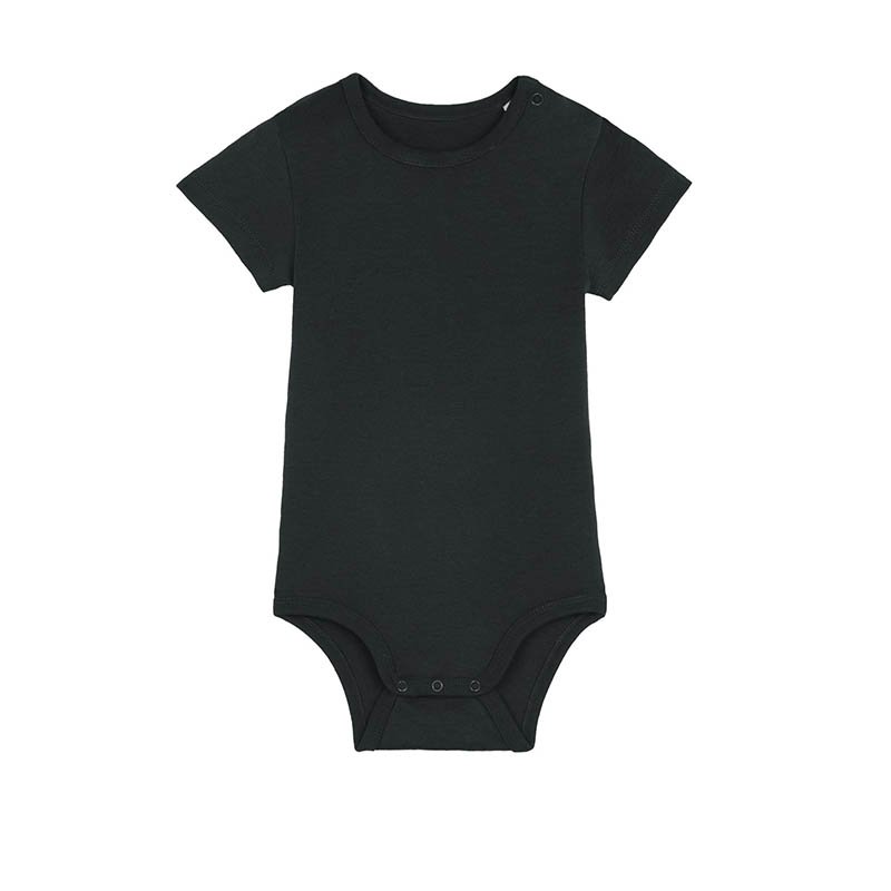 Set-in sleeve 1x1 rib binding at neck collar and leg opening Snap placket at shoulder Snap closure at bottom