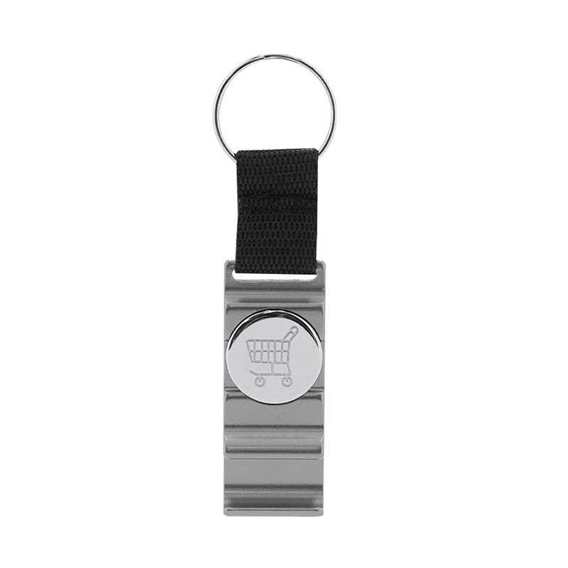 Kovová kľúčenka so žetónom do nákupných vozíkov s otváračom na fľaše.