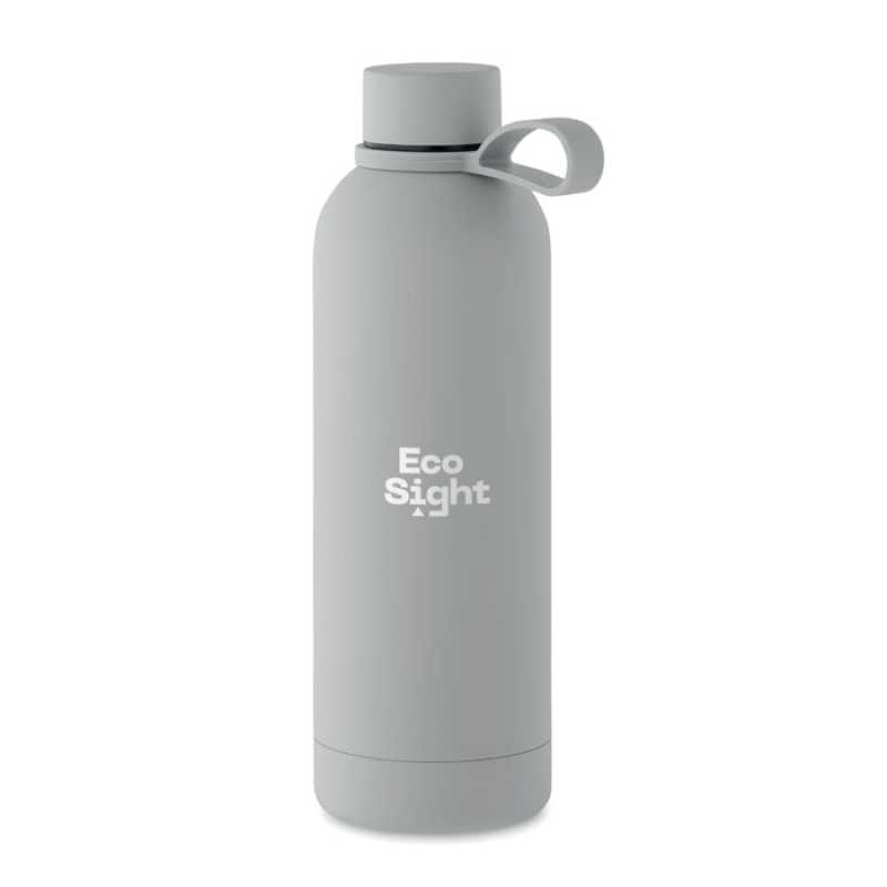 Dvoustěnná izolační láhev z recyklované nerezové oceli (90 % recyklované nerezové oceli a 10 % nerezové oceli) s gumovou povrchovou úpravou a silikonovým poutkem. Objem: 500 ml.