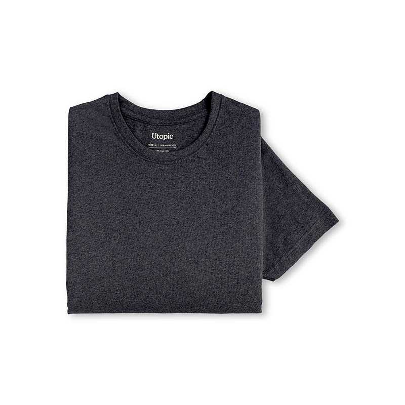 100% regenerated single jersey fabric. Unisex short sleeve T-shirt, double layer ribbed collar with double stitching, reinforcement tape at neck, side seam construction. 145 g/m2. 60% re