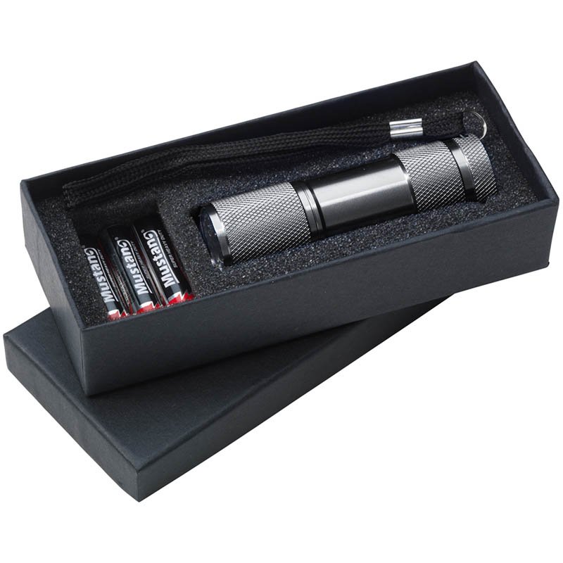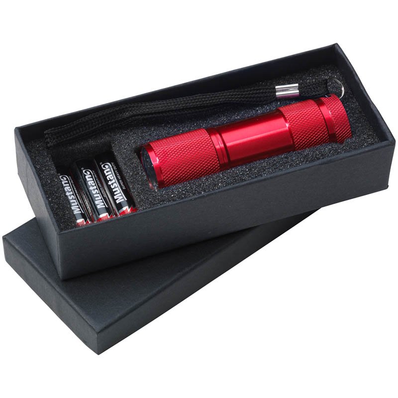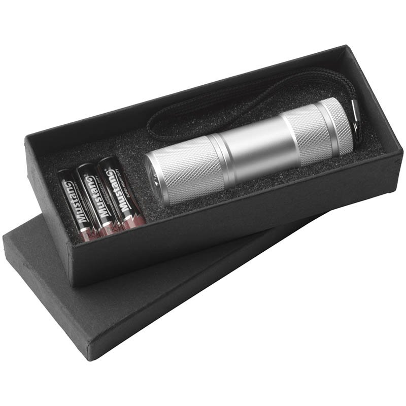 Aluminium torch with 9 energy efficient LED lights, which give a bright white beam. With detachable strap. Meas. O 2.7 x 9 cm. Batteries incl. Each piece in a box.