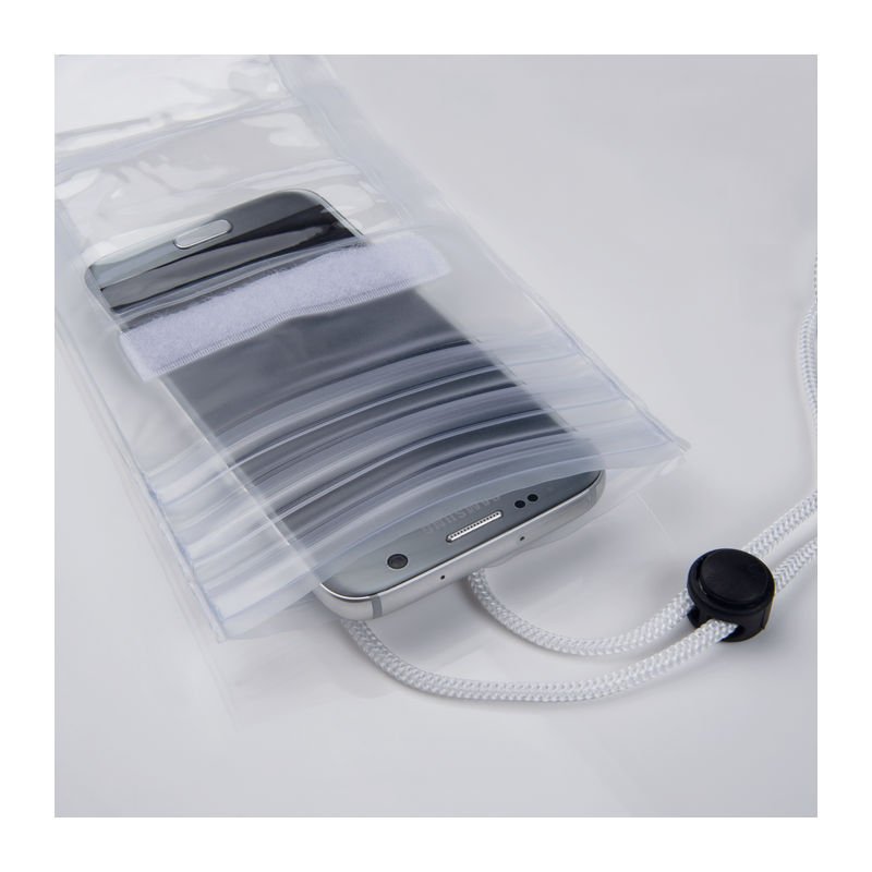 Voděodolné pouzdro pro smartphone z PVC s polyesterovým popruhem. Bezpečnostní spona. Pouzdro má tenčí povrch, který umožňuje ovládání dotykového displaye z venku.