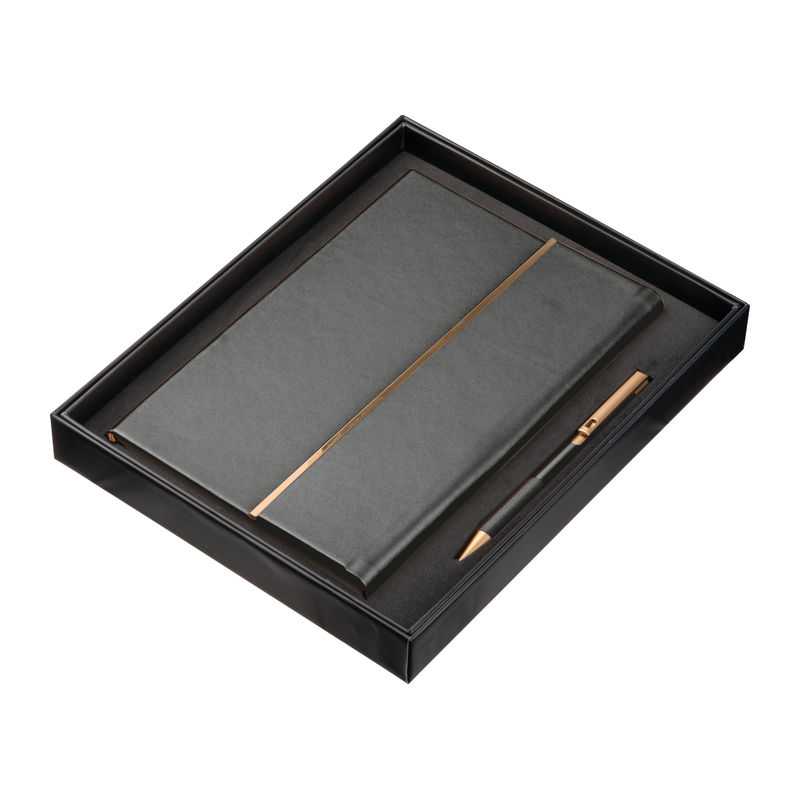 NOVINKA 2025. Notebook and pen set made from recycled PU and recycled aluminum. In elegant matte black with distinguished rose gold finish accessories.Hard covers notepad, made from Recycled PU, with magnetic closure and rose gold trim. With 80 cream coloured pages in single-stripe layout, matching bookmark and pen holder on the inside, plus Recycled PU logo on the back cover.The set is completed by a Recycled Aluminium ball pen in matt black with rose gold accents and metal clip. Twist-action mechanism and blue ink, with Recycled Aluminium logo.Presentation in an elegant black case.The Recycled PU leather stands out for its resistance and elasticity. This recycled and recyclable material is a sustainable option that rescues the fibres discarded in the manufacturing processes, thus minimising the waste of material and contributing to reduce the environmental impact, while keeping its original properties.Recycled Aluminium is a material with almost infinite recycling possibilities, without losing its original properties and consuming less energy in the process.GRS (Global Recycled Standard) certification, guaranteeing the recycled origin of the material used to manufacture the product.