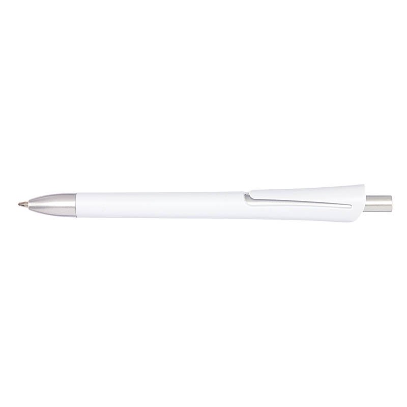 NOVINKA 2025. Push-up ball pen with bold tricolor design with brightly colored details and smooth body in solid white. With original matching color curved clip and comfortable grip. Blue ink.