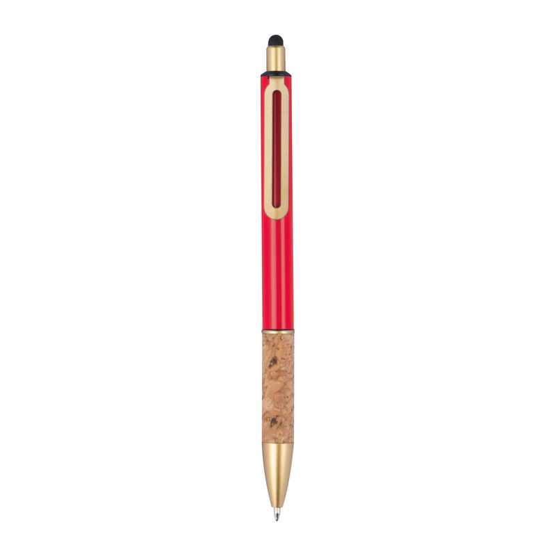 Kovové guľôčkové pero so zlatými aplikáciami, modrou náplňou a korkovou zónou.