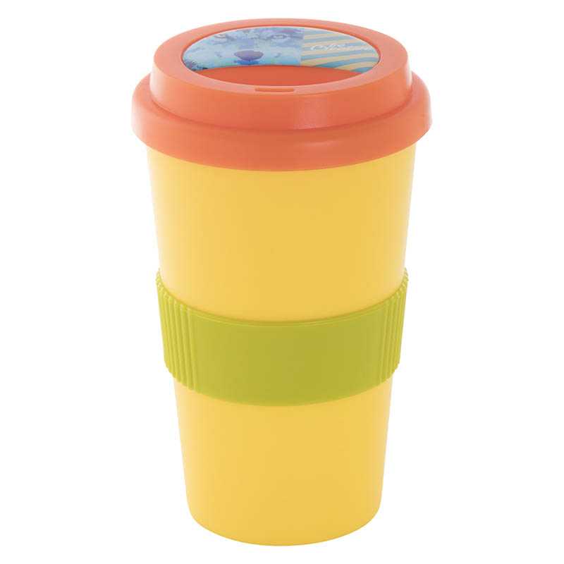 Dvojstenný plastový termo hrnček na zákazku s viečkom na pitie a so silikónovým úchopom, 400 ml. Min. mn. 50 ks.