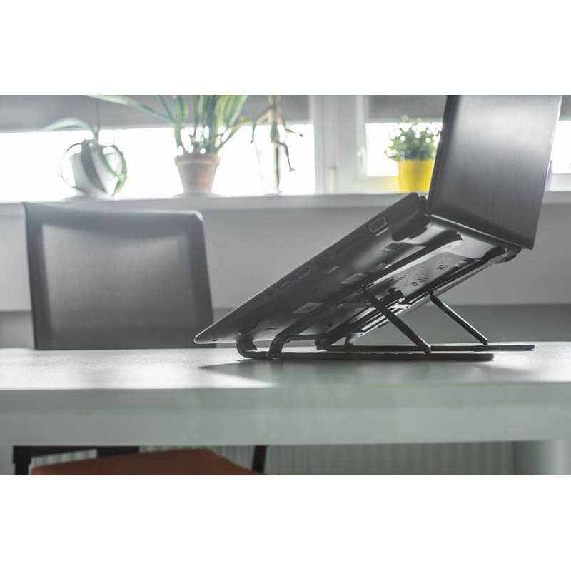 Stojan na notebook FOLD poskytuje větší pracovní komfort a přispívá k lepšímu chlazení zařízení. Příslušenství má lehkou, ale pevnou strukturu, kterou lze složit a upravit. Umožňuje vám zvedat zařízení v různých úhlech, což se projeví ve vylepšené ergonomii a udržení zdravé polohy při práci na notebooku nebo tabletu. Má silikonové protiskluzové prvky, které pouze zvyšují komfort používání. Poskytuje stabilní držení pro zařízení do velikosti 15 palců. Sada obsahuje tašku non -woven.