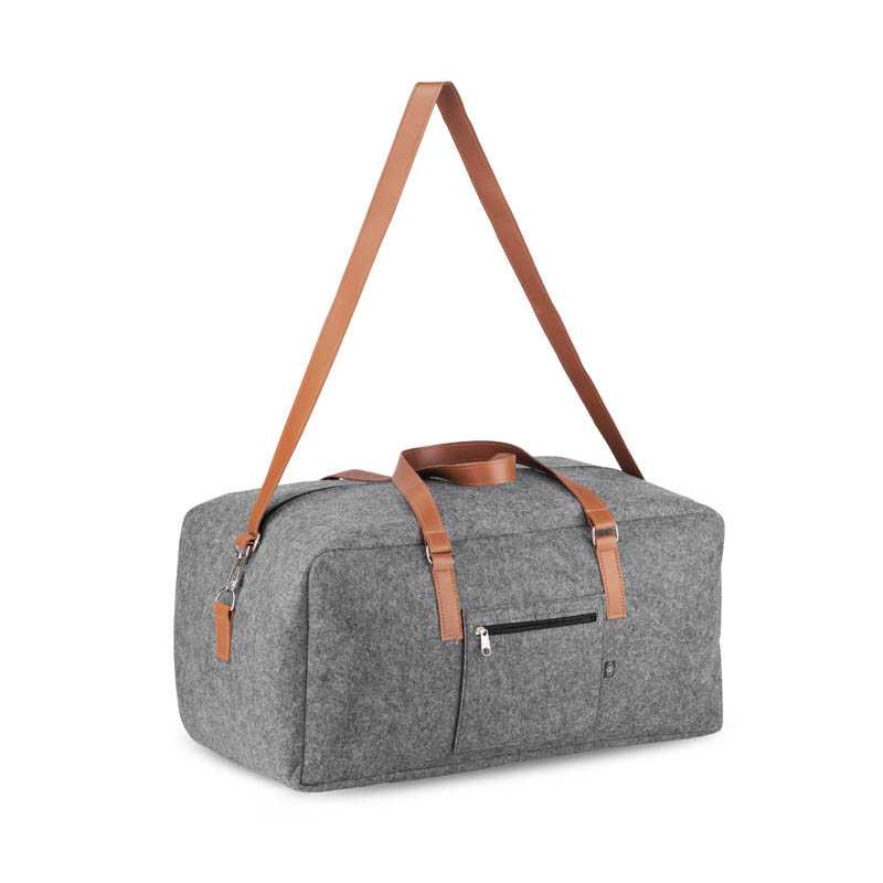 RPET felt travel bag with PU details and carrying strap. One large compartment with zipper, small pocket without zipper.