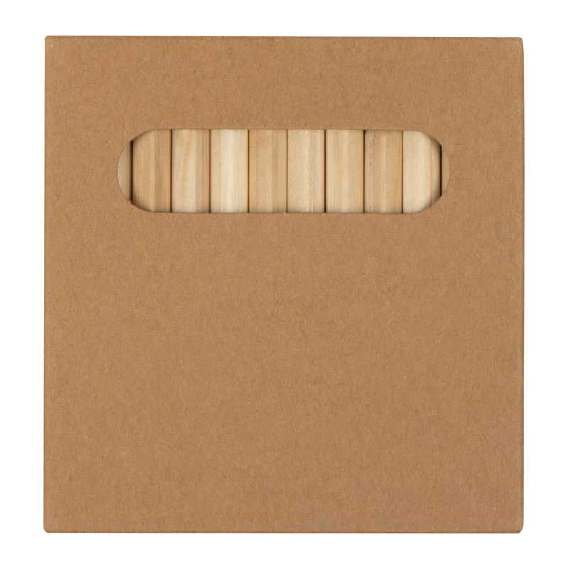 Kartónová krabička s 12 drevenými pastelkami. 90 x 90 x 9 mm