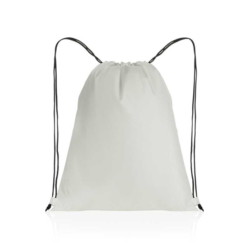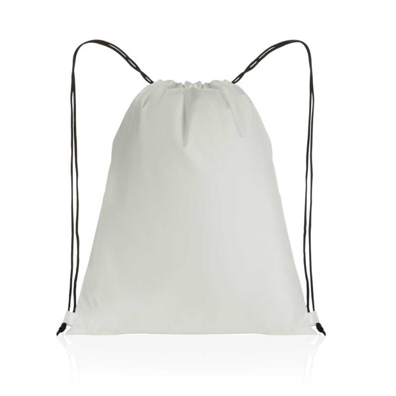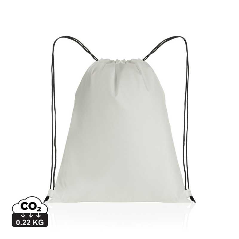 RPET polyester (600D) drawstring bag. Cork bottom and nature colour. Small pocket on front. With RPET label.