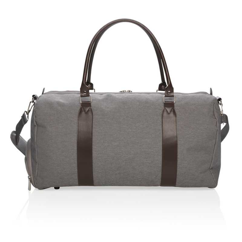 NOVINKA 2025. Stylish bag in durable 475g/m2 grey canvas, with durable and functional leatherette handles all around the bag and reinforced corners. Main compartment with zipper closure matching the handles and adjustable shoulder strap with carabiner fastening. Including easy-access outer pocket.Presented in an individual recycled bag.