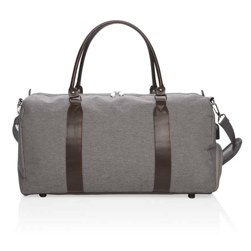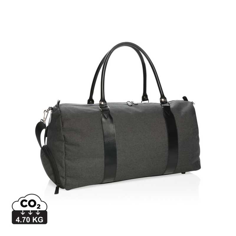 Štýlová 600D polyesterová víkendová taška s ušami z PU a pohodlným ramenným popruhom. Veľká hlavná priehradka s množstvom miesta pre vaše víkendové nevyhnutnosti či športové vybavenie. Ľahko môžete pripojiť powerbanku k integrovanému dobíjecímu USB A portu a nabíjať tak telefón či tablet za chôdze. Praktické vrecko na bočnej strane. Bez PVC.