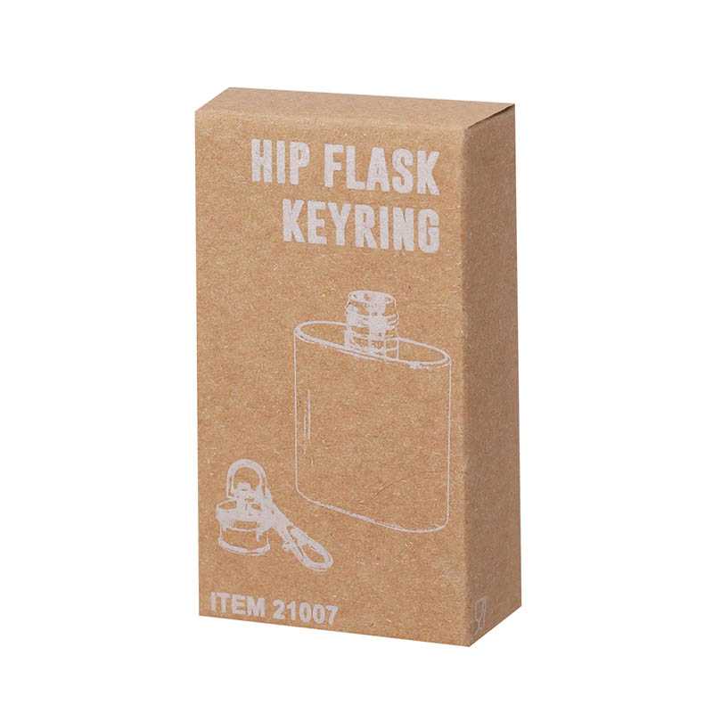 NOVINKA 2025. Handy flask keychain made in stainless steel, with 30 ml capacity. Lid with screw-on security lid and swivel hook. Presented in an individual, kraft design box.
