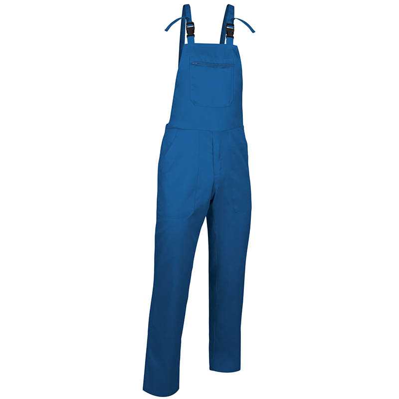Dungarees. Made of a sturdy cotton twill fabric blended with polyester for strength and durability.Front bib with adjustable straps with snap fasteners for a better fit.Lower trousers with concealed fly under flap, left side button fastening and elasticated waistband on back half for easy donning and better fit.Two large front hip pockets, a right patch back pocket and a zippered central pocket at the top for convenient storage and showcase the branding. Suitable marking methods: screen printing, embroidery, transfer printing, vinyl application.Ideal as festive clothing and also as workwear.