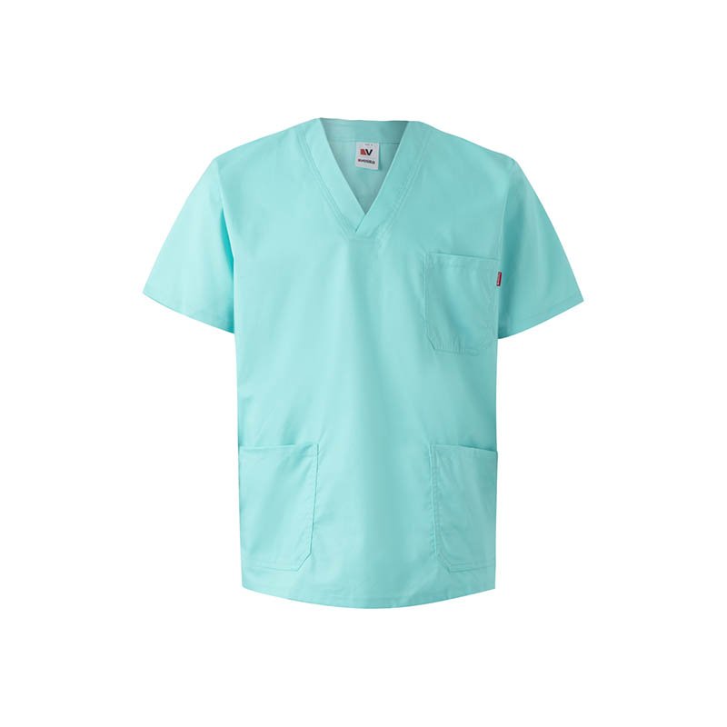 Front button closure V-neck Contrast colour on facing Darts on chest and back Semi-fitted Two pockets: 2 lower patch pockets