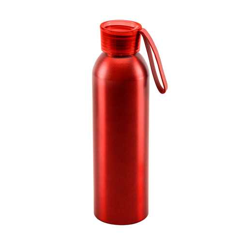 Fľaša z recyklovaného hliníka s viečkom v zodpovedajúcej farbe a silikónovým popruhom, 600 ml.
