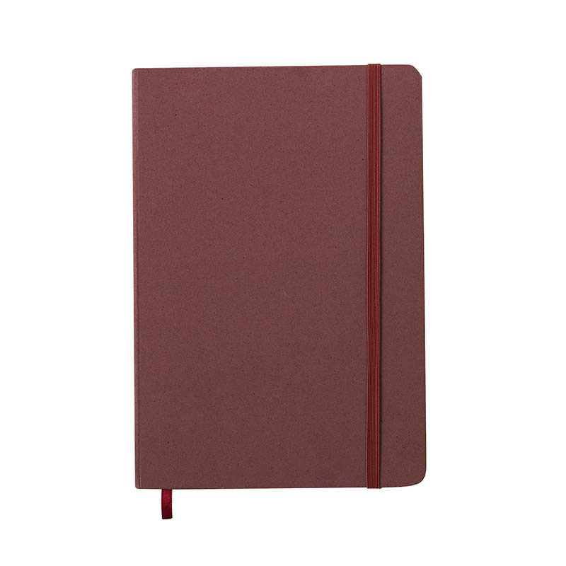 NOVINKA 2025. A5 notepad with hard covers made from fruit. Inside with 80 sheets of single stripe layout, with matching bookmark and elastic band. Available in a variety of kraft finish colours. Includes Fruit Paper logo on back cover. Presented in an individual recycled bag.By mixing waste and residues from the agri-food industry with other recycled materials, a 100% sustainable paper is obtained: fruit paper. Encouraging its use is a contribution to the reuse of materials, and to a greater environmental commitment.