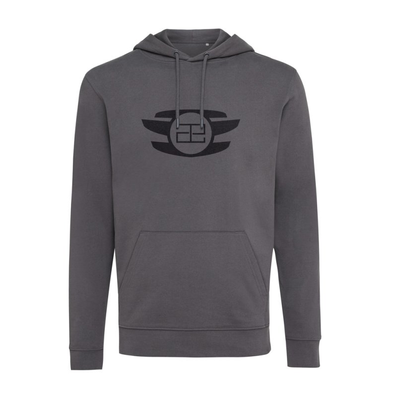 Kvalita.80 % organicky pestovaná bavlna – 20 % recyklovaný polyester.3 priadze .Kartáčovaná podšívka.Zvonku: 100 % organická bavlna.Štýl.Strihané a šité.Raglánové rukávy.2 x 2 rebrované manžety a spodný okraj.Polmesiac vnútri goliera.Páska na krku.Sťahovacia šnúrka s kovovými očkami a zátkami.Kapucňa s podšívkou z džerseja.