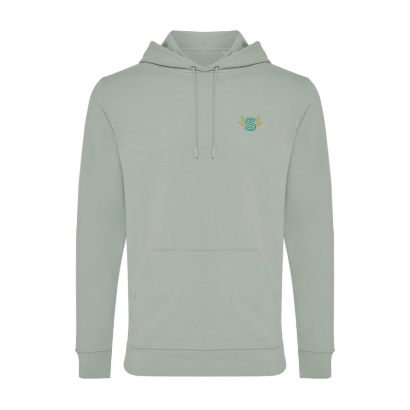 Kvalita.80 % organicky pestovaná bavlna – 20 % recyklovaný polyester.3 priadze .Kartáčovaná podšívka.Zvonku: 100 % organická bavlna.Štýl.Strihané a šité.Raglánové rukávy.2 x 2 rebrované manžety a spodný okraj.Polmesiac vnútri goliera.Páska na krku.Sťahovacia šnúrka s kovovými očkami a zátkami.Kapucňa s podšívkou z džerseja.