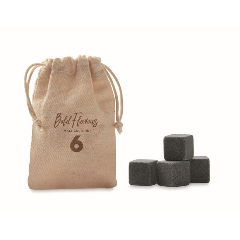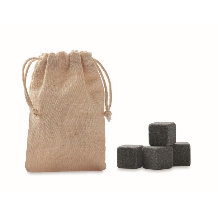 NOVINKA 2025. Set of 4 reusable ice cubes.Made of granite, keeping the drink cold without altering its properties by not diluting its content in water, as well as maintaining its original flavour. Presented in a cotton pouch with a drawstring closure.
