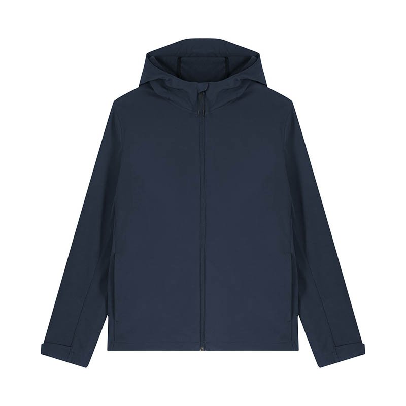 Set-in sleeve High collar and panelled hood Hood opening and bottom hem with adjustable plastic stopper and elastic cord Reverse nylon zip at center front Zipped welt pockets with reflective elastic puller Fully bonded 3 layer fabric with recycled TPU