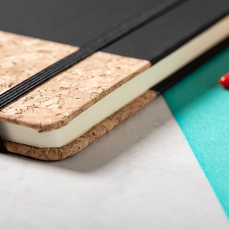 NOVINKA 2025. Nature line notepad in a combination of natural cork and PU leather with hard covers. 100 blank sheets with natural finish, elastic band for fastening and matching fabric bookmark. Available in a wide range of colours.
