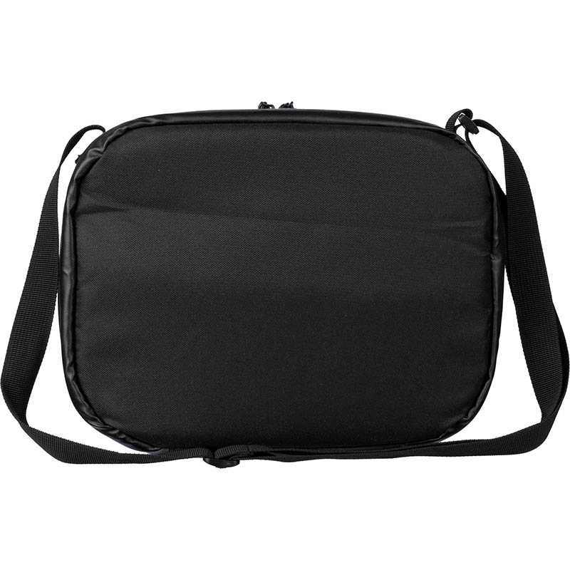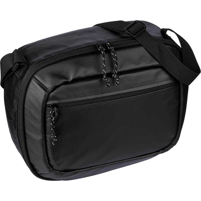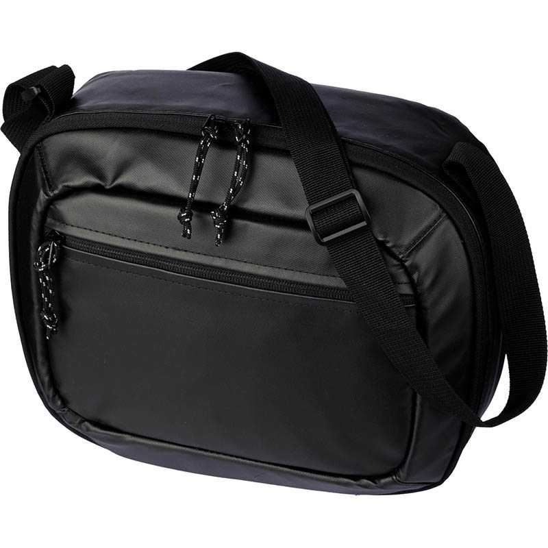 Polyester (600D) cooler bag with PEVA lining on the interior. Open front pocket. The strap is adjustable.