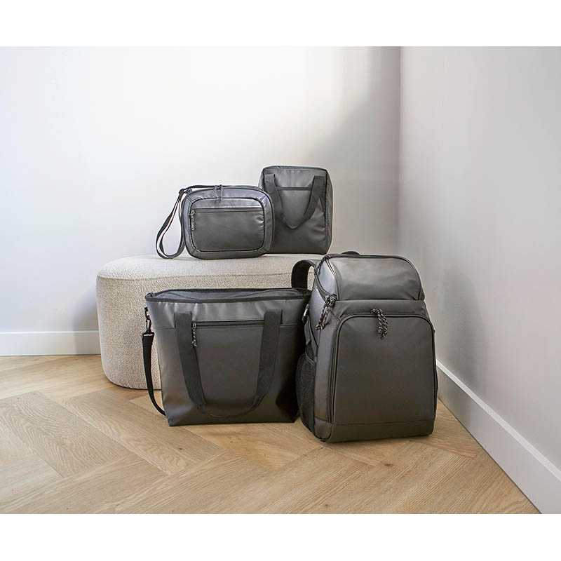 NOVINKA 2025. Cooler bag made of resistant 600D RPET. Grey finish, with brown PU leather base and shoulder strap. Including 2 independent compartments, with zip closure and metal pullers. PEVA isothermal inside and outside label with the RPET distinctive.RPET material is made from recycled plastic, to encourage the reuse of plastic waste and help the sustainability of the planet.