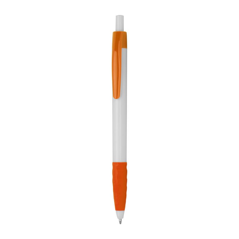 Plastové guľôčkové pero s modrou náplňou na písanie. Biele telo, farebný klip a farebná časť na uchopenie.