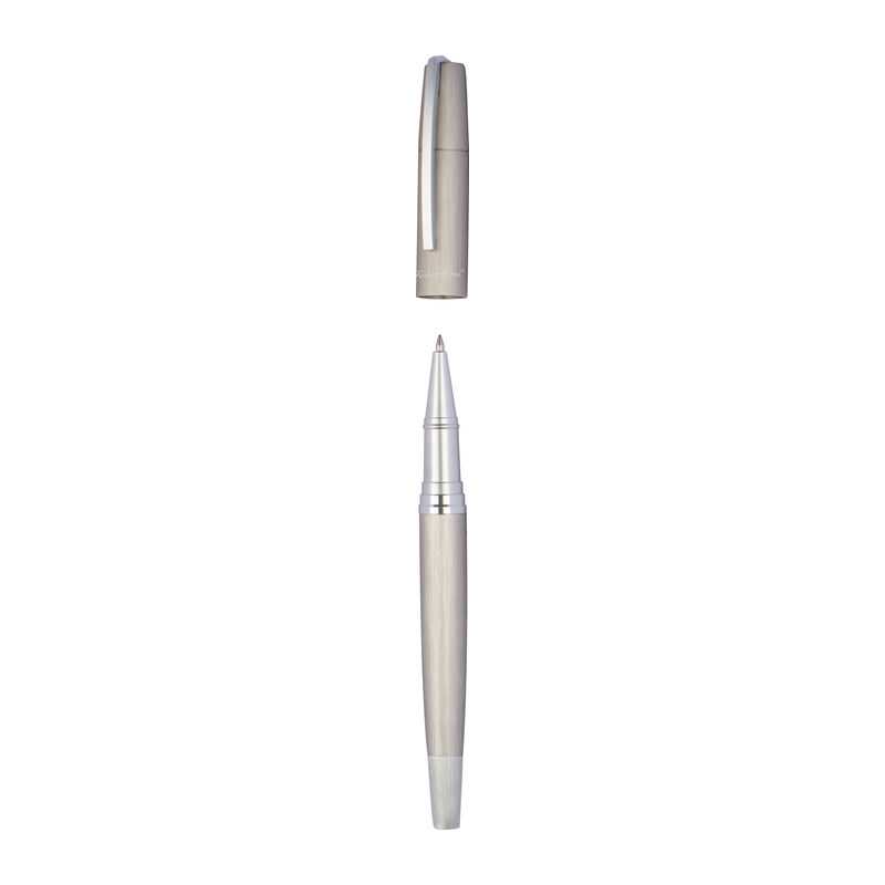 Písacia sada Ferraghini z elegantného matného brúseného kovu. Sada pozostáva z modrého guľôčkového pera s otočným mechanizmom a rolleru.