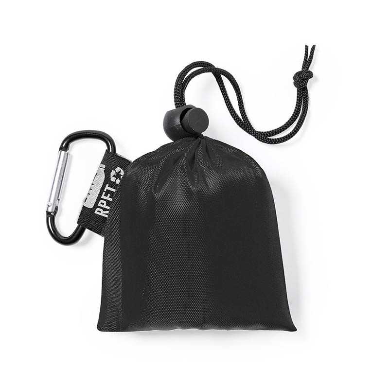 NOVINKA 2025. Adult poncho in LDPE material. In size 102x127cm and presented in a RPET polyester bag, made from recycled plastic, encouraging the reuse of plastic waste and helping the sustainability of the planet. Bag with matching carabiner for portability and adjustable closure, available in a wide range of colors. With RPET outside label.