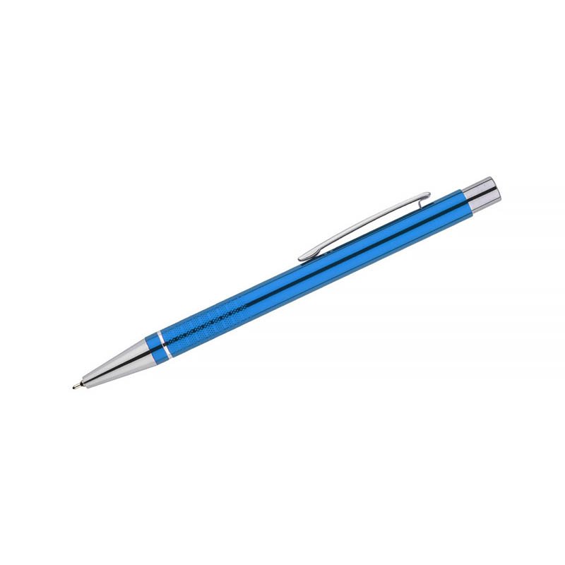Hliníkové guľôčkové pero s pogumovanou úpravou a modrou náplňou. Špeciálny povrch na zrkadlové gravírovanie.