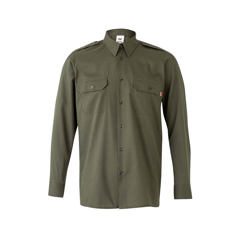 Front closure with double cover flap Italian-style shirt neck with collar stiffeners Back yoke Cuff openings with button closure Spare button