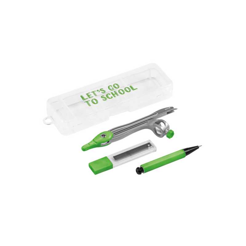 Geometrický školský set v puzdre z PP. Obsahuje: 1kružidlo, 1 pentelka a 10 túh do pentelky o priemere 0'5 mm. 128 x 42 x 20 mm
