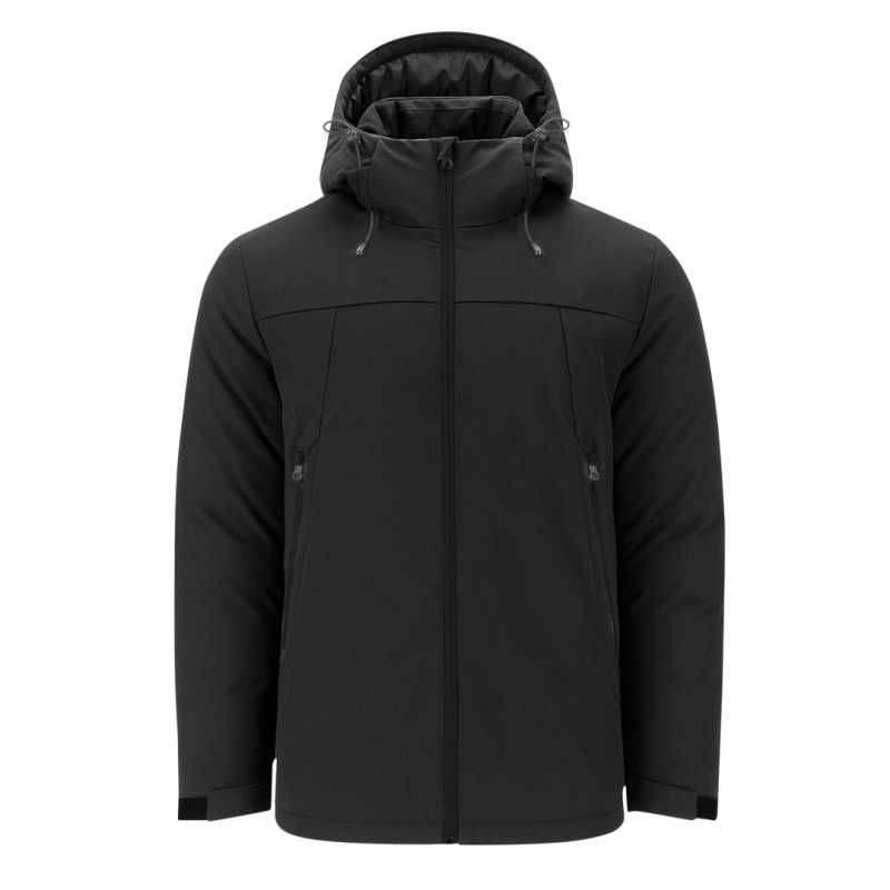 NOVINKA 2025 XMASS. Unisex padded parka with adjustable fixed hood. Features black front zip with chin guard for added comfort and protection, two side pockets with black zip closure, and adjustable cuffs with Velcro.