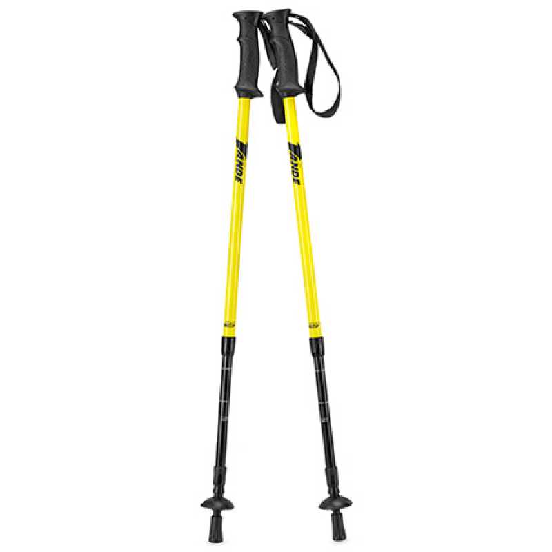 Practical Pair of trekking poles with 3 elements, in aluminum alloy 5083 and 6061 yellow color. PP and rubber compound handle. PP wrist strap with adjustment without buckle. Extension from 110 to 140 cm, with length locking by system. Temper