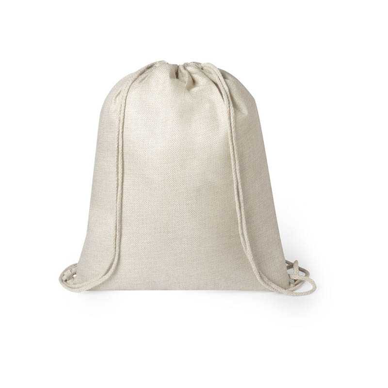 Vak z recyklovanej bavlny na sťahovanie silnými pletenými šnúrami, s dlhými uškami. Dá sa tiež použiť ako nákupná taška. 100% recyklovaná bavlna, 140 g/m2.