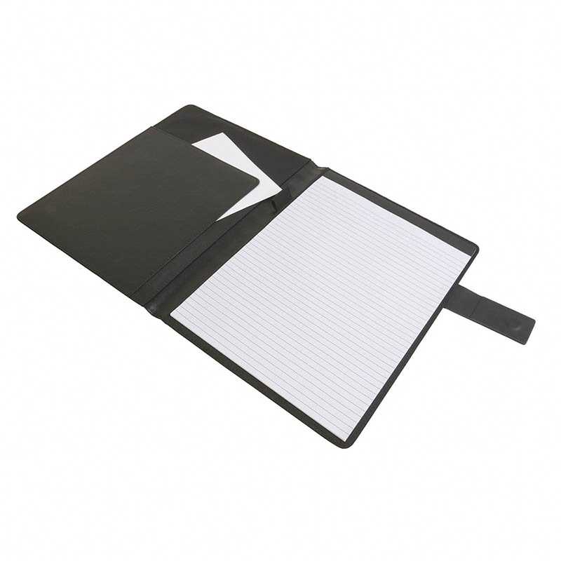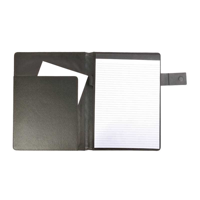 Elegantní portfolio vyrobené z ekokože. Uvnitř je 1 velká kapsa na dokumenty, 1 střední kapsa a 6 malých kapes na vizitky. Navíc je tu vystlaný sešit (20 listů A4). Sešit není přilepený na kryt, ale jen vsunut do kapsy, což umožňuje jeho výměnu.