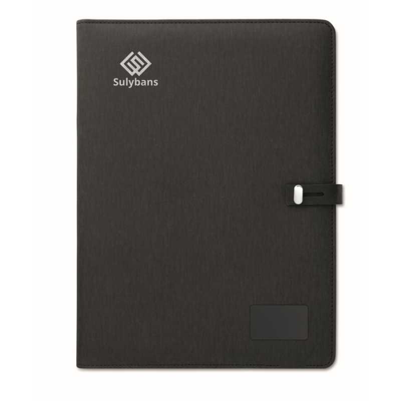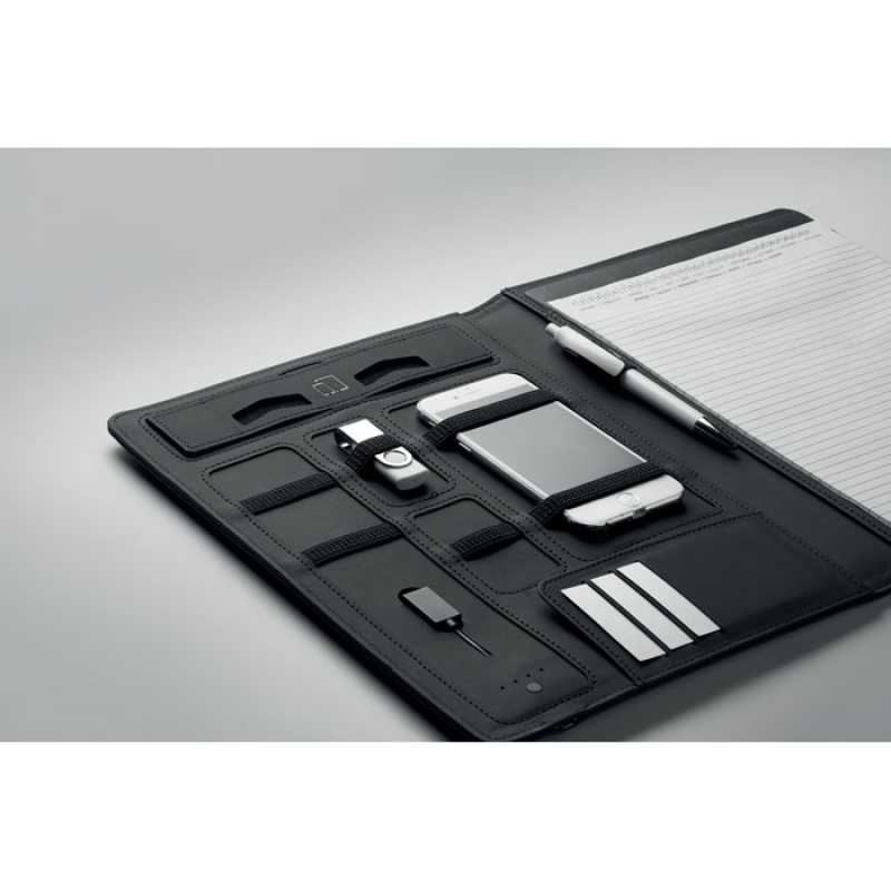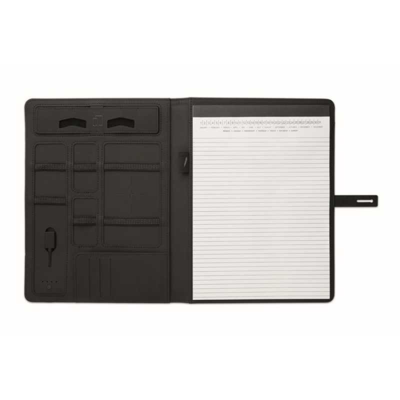 A4 konferenční desky na dokumenty s PU podšívkou. Obsahující DC5V/1A bezdrátovou power banku 4000 mAh. Konektory micro USB a typ C. 40 stránkový linkovaný blok a několik vnitřních kapes. Černý kovový plíšek vhodný pro Vaše logo.