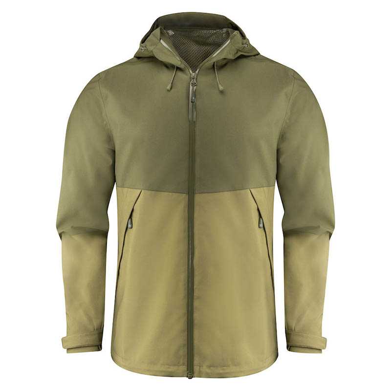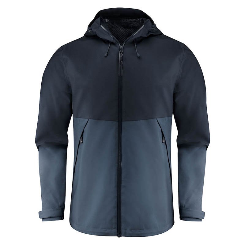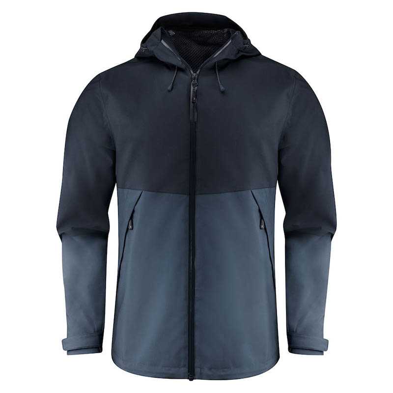 Functional, two-tone shell jacket with taped seams. Waterproof zipper at center front and reversed nylon zippers at side pockets. Velcro adjustable sleeves. Mesh lining with inner pocket. Reflective tag on center back. Hood and bottom hem adjustable with elastic cord. Do not use softener. Colors: 600 navy, 704 moss green, 900 black Shell: 50% Polyester, 50% Recycled Polyester, WP 5000/ MVP 5000, BIONIC-FINISH ECO Water resistand finish Lining: 100% Polyester mesh Sleeve lining: 100% Recycled Polyester S-3XL
