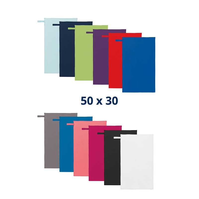 NOVINKA 2025. 100x50cm towel in absorbent and soft microfiber of 185g/m2 in varied colors. Presented in a practical mesh bag with adjustable accessory.