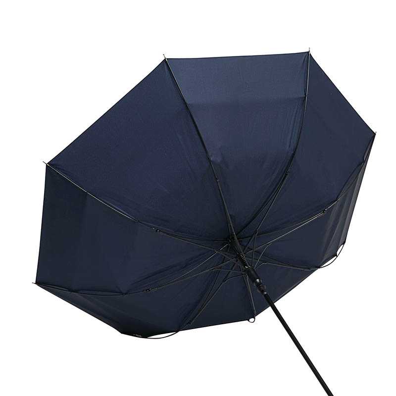Umbrella with 190T pongee nylon canopy, storm proof design, automatic telescopic opening, fibreglass frame and shaft, soft foam handle and velcro fastener. In a pouch.