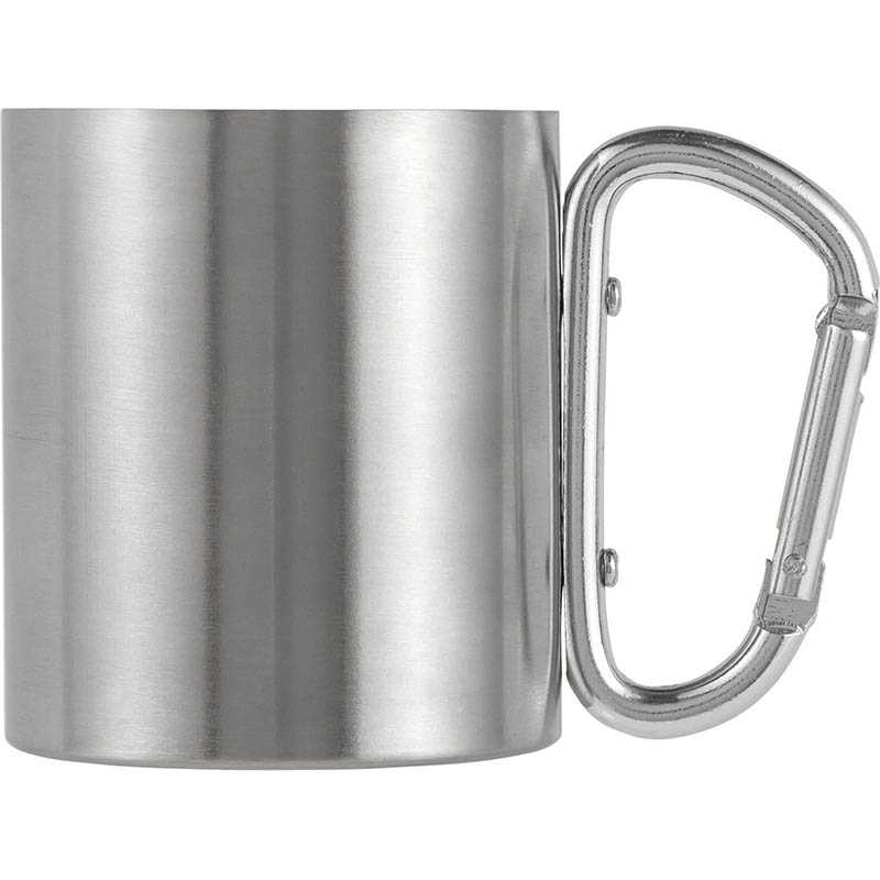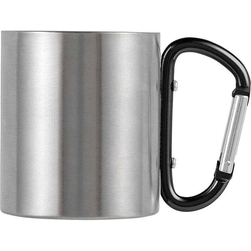 Stainless steel, double walled travel mug (185 ml). The handle functions as a carabiner.