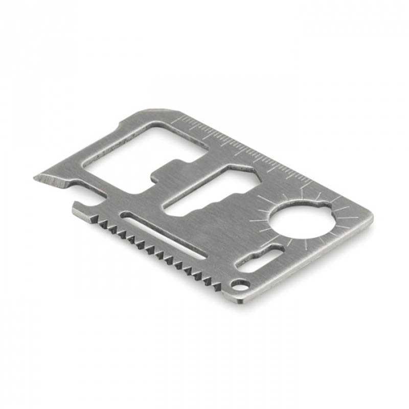 Stainless steel multifunctional tool with 11 functions. Functions include: knife, can opener, butterfly nut, saw, screwdriver, bottle opener, ruler, and different sized wrenches. Packaged in PU pouch.