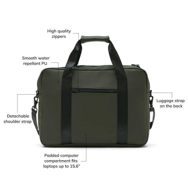 Taška na notebook s moderným a čistým dizajnom. Kombinácia funkčnosti a formy: okrem bežného vrecka na notebook má táto taška aj priestor na perá a ceruzky, dokumenty a ďalšie veci. Taška je vyrobená z vodoodpudivého materiálu, má ramenný popruh a uši na prenášanie. Na zadnej strane je vybavená popruhom na umiestnenie na rukoväť kufra. Vhodné pre až 17" notebooky.