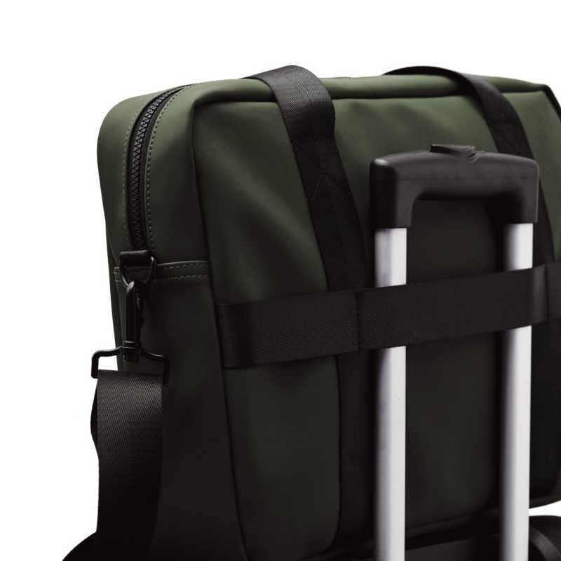 Velká, na zadní straně polstrovaná hlavní kapsa s 2cestným zipem, vrchový materiál rPET, kvalitní kovové doplňky, polstrovaná přihrádka např. pro notebooky, plochá přední kapsa na zip, upevnění na zadní straně pro teleskopickou tyč, snímatelný, délkově na