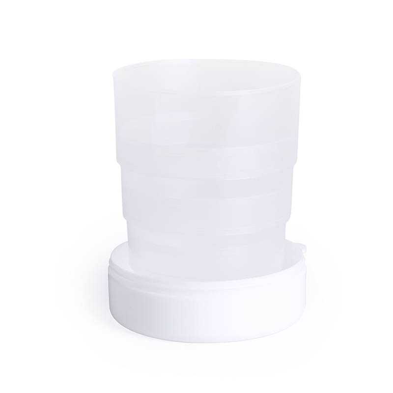 NOVINKA 2025. Bold folding cup for emergencies. In an elegant white color design and 220ml capacity, Including lid with integrated pill holder, with metal carrying carabiner.