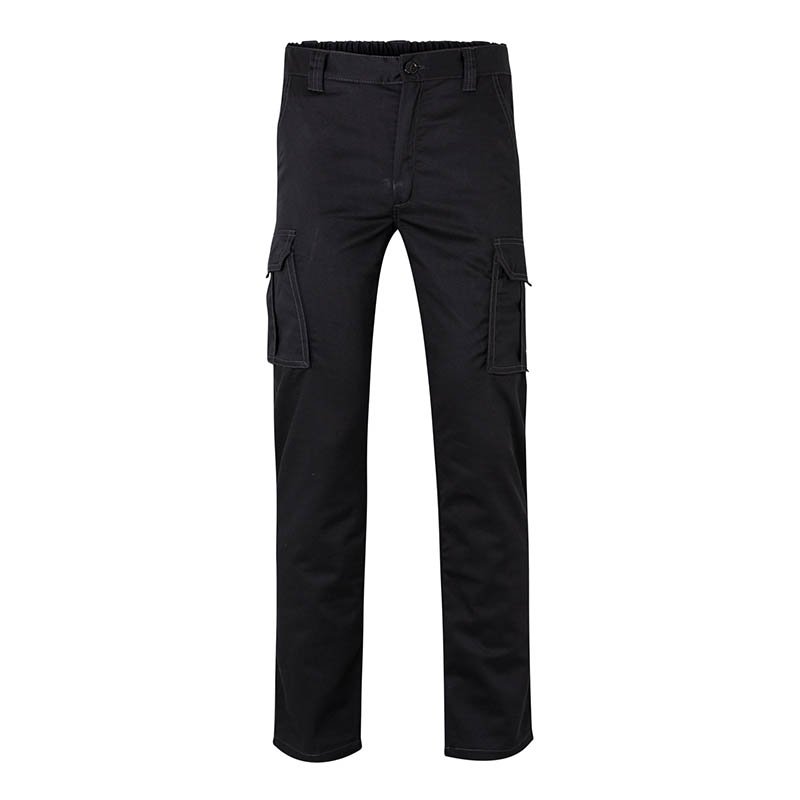 Front zip with button Seams with contrasting thread Elastic waistband Double safety seam Six pockets: 2 French pockets 2 double bellow pockets with cover flaps, Velcro and handles 2 bac